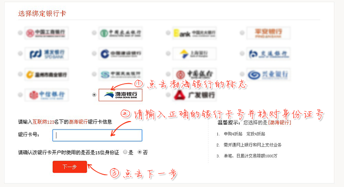 填写渤海银行卡号,确认此卡对应的证件号码位数,默认是18位身份证,勾选表明是15位身份证。