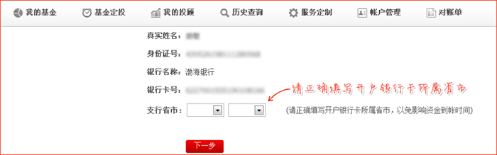 请正确填写开户银行卡所属省市,然后点击下一步。