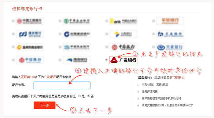 填写广发卡号,确认此卡对应的证件号码位数,默认是18位身份证,勾选表明是15位身份证
