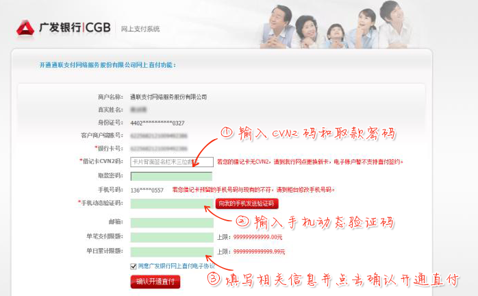 输入CVN2码、获取并填写手机动态验证码,填写邮箱,设置支付限额,点击确认开通直付