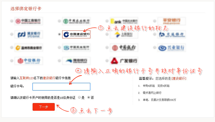 填写建行卡号;确认此卡对应的证件号码位数,默认是18位身份证,勾选表明是15位身份证