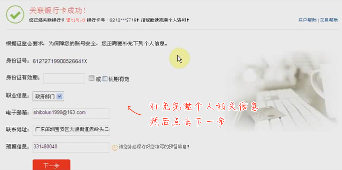 验证完成关联银行卡成功,补充完善个人信息,点击下一步