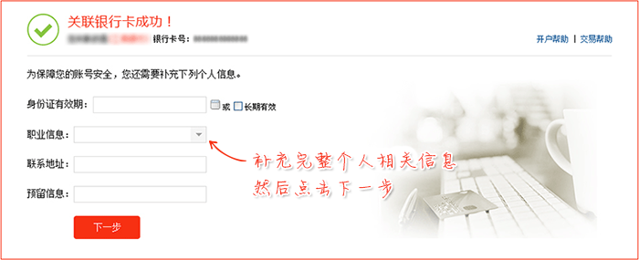 为了保障您的账号安全,您还需要补充完整相关个人信息,然后方可进行交易。