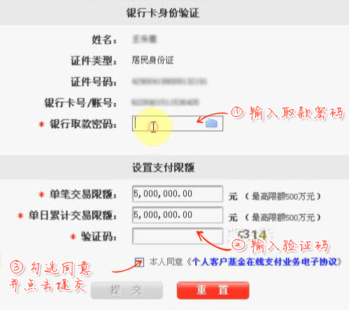填写银行6位数密码,设置交易限额,输入验证码,勾选同意协议,点击提交