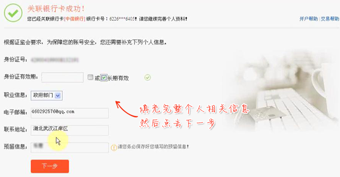 验证完成关联银行卡成功,补充完善个人信息,点击下一步