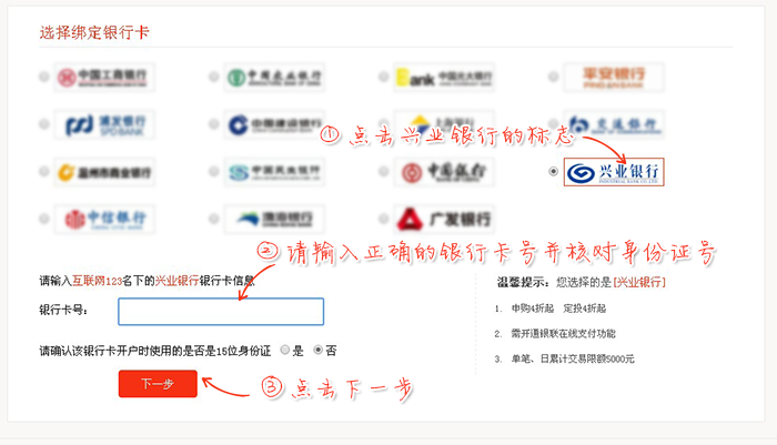 填写兴业卡号,确认此卡对应的证件号码位数,默认是18位身份证,勾选表明是15位身份证