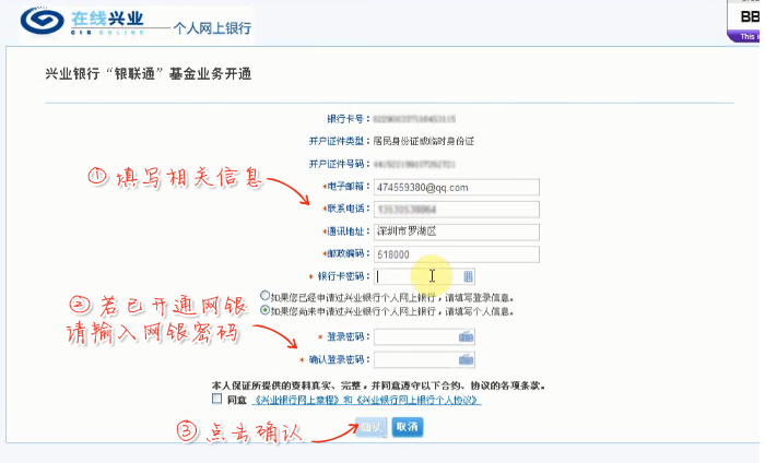 填写电子邮箱,填写联系电话,填写通讯地址,填写邮政编码,填写银行卡6位数密码,选择是否办理网银,若办理则填写网银登录密码